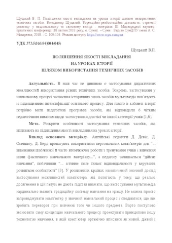 - Щуцький, В.П. (2018) Improving the quality of teaching history through the using technical means Корекційно-реабілітаційна діяльність: стратегії розвитку у національному та світовому вимірі : матеріали ІІІ Міжнародної науково-практичної конференції (18 квітня 2018 року, м. Суми). pp. 100-104.