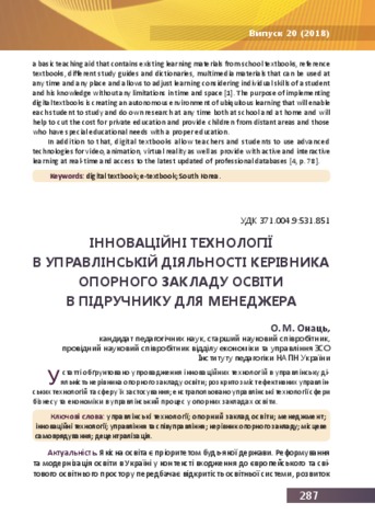 - Онаць, Олена Миколаївна (orcid.org/0000-0003-3323-1289) (2018) Innovative technologies in the managerial activity of the head of the base educational institution in a textbook for managers Проблеми сучасного підручника (20). pp. 287-297. ISSN 2411-1309