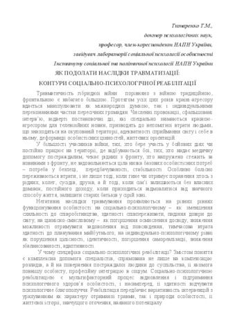 - Титаренко, Тетяна Михайлівна (orcid.org/0000-0001-8522-0894) (2018) How to overcome the consequences of traumatism: contours of socio-psychological rehabilitation In: Філософсько-соціологічні та психолого-педагогічні проблеми підготовки особистості до виконання завдань в особливих умовах: матеріали міжнародної науково-практичної конференції, 7 червня 2018 року . Національний університет оборони України ім. І.Черняховського, м. Київ, Україна, pp. 221-224.
