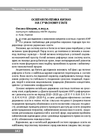 - Шпарик, Оксана Михайлівна (2018) China's educational policy at the present stage In: Педагогічна компаративістика і міжнародна освіта – 2018: трансформації та інновації в освіті у глобалізаційному світі: матеріали ІІ Міжнародної наук.-практ. конференції . Інститут педагогіки НАПН України, м. Київ, Україна, pp. 142-144.
