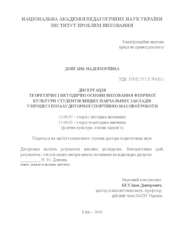- Довгань, Н.Ю. (2018) Theoretical and methodical principles of university students’ physical education during extracurricular sports work Masters thesis, Інститут проблем виховання.