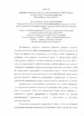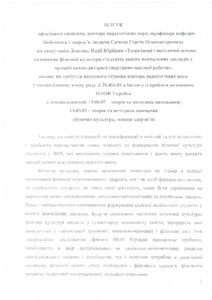Dissertation for a scientific degree of Doctor of Educational Sciences in speciality 13.00.07. – Theory and Methods of Education, 13.00.02. - Theory and Methods of Teaching (Physical Education, Bases of Health). – Institute of Problems on Education of the National Academy of Educational Sciences of Ukraine. – Kyiv, 2018. The dissertation is devoted to theoretical, methodical generalization. It offered a new approach to solving the actual problem of university students’ physical education in the process of extracurricular sports-mass work. The conceptual foundations of university students’ physical education in the process of extracurricular sports-mass work are determined; the cultural-historical retrospective of the issue of the person's physical culture education was made and the scientific approaches (personally oriented, activity oriented, systemic, environmental) to the university students’ physical education were suggested, which enabled to characterize the modern theoretical principles of university students’ physical education. The conceptual completeness of university students’ physical culture education is substantiated; the essence and structure of the concept "physical culture of a student's 9 personality" is determined, which is considered as the reasoned need and ability of the individual for physical self-perfection, aimed at his/her comprehensive and harmonious development, covering the whole set of physical, mental, moral-volitional and spiritual qualities acquired in physical culture classes at higher educational institutions; psychological and pedagogical factors and regularities of university students’ physical culture education are established; the strategy of students’ physical culture formation is described. The strategy of university students’ physical culture education as a holistic psychological and pedagogical phenomenon is based on the understanding of the essence of its components (cognitive, emotional, value, behavioral and activity), it takes into account the origins of the physical culture of an individual, based on varieties of physical culture, and has in their essence material, spiritual and aesthetic values. Psychological and pedagogical factors of physical culture upbringing of student's personality are considered as a special combination of subjective (the totality of motivational settings, values orientations, individual consciousness and student's outlook) and objective factors which are characterized by modern conditions of educational process’ organization in higher educational institutions. The regularities of university students’ physical culture education in the process of extracurricular sports-mass work, determine the social and personal development of student youth, take into account the peculiarities of the formation of human physical culture’ components, as well as biological laws which ensure the normal interconnection of the organism with the environment for the formation of abilities to physical education activity. The general didactic principles of physical education (nature and culture correspondence in teaching, individual-personal approach, harmonious (value) personality development, health orientation, connection with student's life activity) and specific principles of physical education (legitimacy, democratization of educational process, systemic, strategic integrity, multidimensionality, systematic, accessibility and individuality, dynamism, pedagogical age adequacy influence) are described. 10 The psychological and pedagogical context of constructing the content of university students’ physical education is constructed. Extracurricular sports and mass work with students is defined as a system of special activities for the formation of personal qualities aimed at the acquisition of knowledge and skills, the formation of future specialists’ competences, which serve as the basis for their personal and professional development. The specifics and the conceptual model of extracurricular sports-mass work in a higher educational institution, aimed at upbringing the physical culture of a student's personality, are revealed. The methodological principles (systemic, integrity, isomorphism, activity mediation, invariance) and the program of empirical research of education of university students’ physical culture education are presented; the criteria, indicators and educational levels of the physical culture of the student's personality are determined; the results of the confirmatory stage of the pedagogical experiment are presented. According to determined components, the criteria (mental, emotional, value, motor activity) and the indices of parenting of physical education of students are substantiated; there were defined four levels of their education (high, sufficient, average, low). The results of the confirmatory phase of the experiment showed an insufficient level of physical education of I-II course students. The revealed state of university students’ physical education confirmed the necessity of substantiation and designing of the pedagogical system for the education of students' physical culture in the process of extracurricular sports-mass work at higher educational establishments and the definition of psychological and pedagogical conditions for its effective implementation. The pedagogical system of university students' physical culture education is grounded and designed in the process of extracurricular sports-mass work at higher educational institutions, the main components of which are reflected in the target (goal and tasks), conceptual (methodological approaches, principles), prognostic (components, criteria, indicators and levels), forming (stages of organization, methods, forms, means and psychological and pedagogical conditions) effective (positive 11 dynamics of education of physical culture of students of higher educational institutions) blocks. Within the framework of the implement