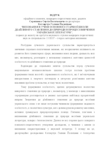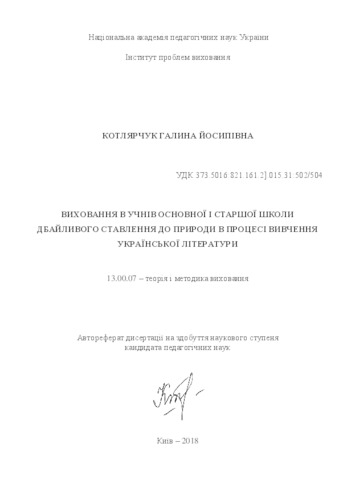 - Котлярчук, Галина Йосипівна (2018) Forming careful attitude toward nature in the students of main and high school in the process of Ukrainian literature’s study Dissertation candidate2 thesis, Інститут проблем виховання.