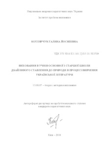 Dissertation for the scientific degree of Candidate of Pedagogical Sciences іn Theory and Methods of Education. – Institute of Problems onspeciality 13.00.07 Education of the National Academy of Educational Sciences of Ukraine. – Kyiv, 2018. In the dissertation research, the new approach to solving the urgent issue of education in the students of main and high school of careful attitude toward nature in the process of study of Ukrainian literature has been offered. The author has carried out the theoretical analysis of concept-terminological meaning of the research and has updated semantic descriptions for base definitions such as: “environmental consciousness”, “environmental culture”, “environmental education”, “attitude toward nature”, “Ukrainian literature”, “fiction”. The essences of research leading concept such as “careful attitude toward nature” have been specified. The concept “careful attitude toward nature” is determined as a special interaction of a student with nature based on conscious emotional-value attitude toward its objects linked with the readiness to support their functioning, to revive and to protect them. Such attitude is, in its essence, non-pragmatic, and the result of the positive “I-conception” development of personality. The components of careful attitude toward nature have been determined: cognitive, emotional and value, behavioral and practical. Criteria and indicators have been described: cognitive (understanding of the essence of careful attitude toward nature; cognitive interest 22 toward nature and reading fiction about it), emotional and value (emotional-value attitude toward objects of nature; motivational-value readiness to care for object of nature), active and practical (the student’s readiness to support, protect, and revive the functioning of objects of nature; the ability of revealing, evaluating and preventing dangerous for nature situations). The levels (low, middle, sufficient) of main and high school students’ careful attitude toward nature have been described. In the paper, the specifics of using the potential of Ukrainian literature in order to form the student’s perception of nature as the most precious value of humanity and corresponding attitude toward it is revealed. Methods of education of careful attitude toward nature during the process of Ukrainian literature’s study in the students of main and high school have been developed, and experimentally tested. Moreover, educational conditions for their effective use in the educational process of general educational institution have been suggested. Methodological guidelines as to forming in students of main and high school the careful attitude toward nature during Ukrainian literature’s study have been substantiated. Methodology of education of careful attitude toward nature in the process of study of Ukrainian literature in main and high school students based on deep study and analysis of fiction of environmental content has been created and experimentally approved. The educational process has been realized in a few stages (formation of cognitive interest toward nature; education of value-emotional attitude toward objects of nature; formation of the readiness to support functioning of objects of nature and to revive and protect them). The educational terms of education are set out for the students of main and high school regarding careful attitude toward nature in the process of study of Ukrainian literature: satiation of the process of studying Ukrainian literature at main and high school by emotionally-positive experiencing the nature and by means of deep analysis of fiction; educational analysis of expedient examples related to careful attitude toward nature and the best standards of Ukrainian folklore used in the process of study of biography of writers and during the analysis of artistic works; development of main and high school students’ inclination to charity in the process of co-operating with nature through improvement of their creative capabilities by facilities of fiction; organization with the students of main and high school of extracurricular work related to Ukrainian literature of environmental line. The results of the forming stage of the experiment have confirmed that in the experimental group positive changes took place in the level of careful attitude toward nature regarding certain components. The author has compiled the manual-reading-book for itself”“Love nature not for yourself, – love for itself”.