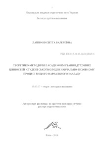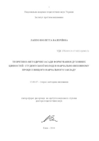- Лаппо, В.В. (2018) Theoretical and methodics principles of spiritual formation of students in the educational process of higher educational establishment Other thesis, Інститут проблем виховання.