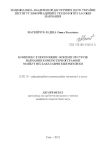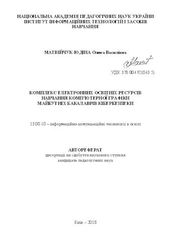- Матвійчук-Юдіна, О.В. (2018) Complex of electronic educational resources of computer graphics training for future bachelors of cybersecurity Dissertation candidate2 thesis, Національний авіаційний університет.