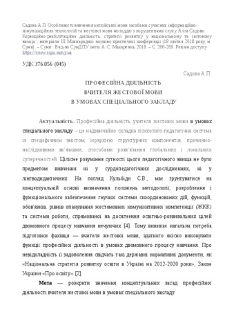 - Садова, А.П. (2018) Professional activity of the Sign language teacher in a special institution Корекційно-реабілітаційна діяльність: стратегії розвитку у національному та світовому вимірі : матеріали ІІІ Міжнародної науково-практичної конференції (18 квітня 2018 року, м. Суми). pp. 266-269.