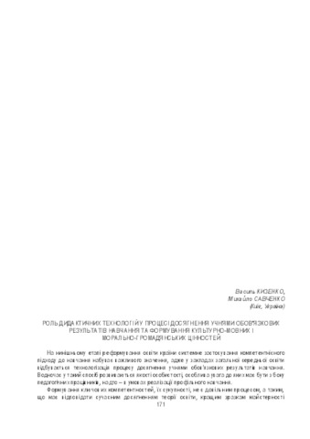 Additional Information: Бібліографічний опис: Кизенко В., Савченко М. Роль дидактичних технологій у процесі досягнення учнями обов'язкових результатів навчання та формування культурно-мовних і морально-громадянських цінностей [The role of didactic technologies in the process of achieving results education and the forming in the pupils’ of cultural and linguistic, moral and civic values]. Розвиток сучасної освіти і науки: результати, проблеми, перспективи [Rozwój nowoczesnej edukacji і nauki - stan, poblemy, perspektywy / red.: J. Grzesiak, I. Zymomrya, W. Ilnytskyj. Konin (Polska) – Użhorod – Drohobyczс (Ukraina): Posvit, 2018. – 382 s.] / ред.-упоряд.: Я. Ґжесяк, І. Зимомря, В. Ільницький]. Конін (Польща) – Ужгород – Дрогобич: Посвіт, 2018. С. 171–173.