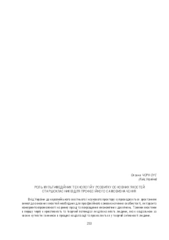 - Чорноус, О.В. (2018) The role of multimedia technologies in developing the basic qualities of upper secondary school pupils in the process professional self-determination In: Rozwój nowoczesnej edukacji і nauki – stan, problemy, perspektywy . Posvit, с. Konin, Poland – c. Użhorod, Ukraine – c. Drohobyczс, Ukraine, pp. 253-255. ISBN 978-617-7235-50-6
