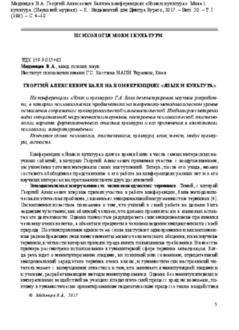 At the conferences “Language and Culture” G. Ball demonstrated his scientifi c researches, in which psychological issues were always associated with culture and linguistic fi elds at the theoretical and methodological level of their understanding. These researches highlighted the emotional loading of the terms, the construction of psychological epistemology, the option of a formalized description of culture and its applications in linguistics, psychology, literary criticism.
