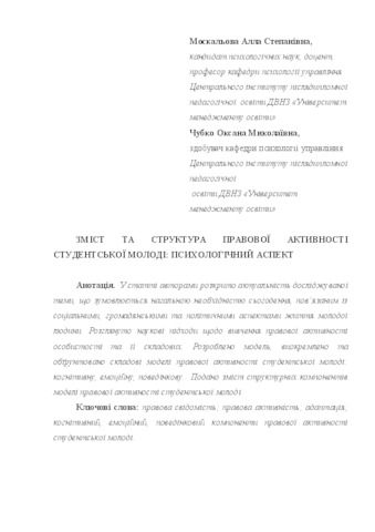 - Москальова, А.С. and Чубко, О.М. (2017) Contents and structure of the legal activity of a student youth: psychological aspect Вісник післядипломної освіти. Серія «Соціальні та поведінкові науки», 4/5 (33/34). pp. 79-93. ISSN 2522-9931