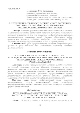 - Москальова, А.С. (2016) Psychological characteristics of the personal potential to overcome professional crises of the secondary schools managers Вісник післядипломної освіти. Серія «Соціальні та поведінкові науки», 2 (31). pp. 61-75. ISSN 2218-7650
