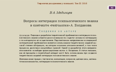 - Мєдінцев, Владислав Олександрович (orcid.org/0000-0002-5171-0139) (2018) Integration of psychological knowledge in the context of "tektology" by A. Bogdanov Теоретичні дослідження у психології, 3. pp. 93-118. ISSN ISBN 978-617-7377-89-3