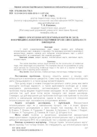 - Спірін, О.М. (orcid.org/0000-0002-9594-6602) and Вакалюк, Тетяна Анатоліївна (orcid.org/0000-0001-6825-4697) (2018) Cloud-oriented intellectual maps as a means of information and analytical support of the teacher's professional activity , 1. pp. 227-234. ISSN 2412-9208