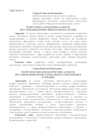 - Супрун, В'ячеслав Васильович (2016) Theoretical and practical aspects of regulation of vocational education in Ukraine Вісник післядипломної освіти. Серія "Управління та адміністрування", 2 (31). pp. 108-123. ISSN 2218-7650
