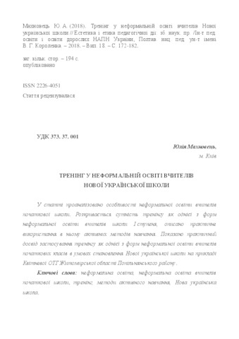 - Махновець, Юлія Анатоліївна (2018) Тraining in non-formal education of teachers of the new Ukrainian school Естетика і етика педагогічної дії (18). pp. 172-182. ISSN 2226-4051