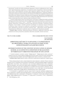 The study reveals the essence of the concepts of “differentiation”, “differentiation of the content of education”. On the basis of scientific and pedagogical works devoted to the problem of differentiation of the content of education in senior school. The purpose and main tasks of educational content of education differentiation for senior pupils is disclosed. The specifics of the process of differentiating the content of education in senior school are determined. The importance of differentiation of the content of education in senior school within modern senior school education is revealed. The list of normative documents regulating the reforms of education in Ukraine is presented. The differentiation of the content of education at the macro, meso and micro levels is characterized. Such forms of organization of differentiation of the content of education in senior school are distinguished and characterized as: internal differentiation, external differentiation, semi-open differentiation, hidden differentiation. A list of elective courses aimed at deepening and expanding knowledge on subjects is given. Distinctions between elective and selective courses are analyzed. The description of types of differentiation of the content of education by the objectives of training, content, methods and technologies, tempo (time) of training, individual psychological characteristics (level of health, personally-psychological types, level of cognitive development, interests, age) and level of the organization of senior pupils are given. Types of differentiation of the content of education are determined. Typical structure of the lesson in senior grades of secondary school is presented.