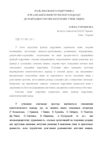 - Горошкіна, Олена Миколаївна (orcid.org/0000-0002-0378-888X) (2018) The role of the school textbook in implementing the competative approach to teaching the Ukrainian language to students of the lyceum Українська мова і література в школі, 3 (138). pp. 2-7. (In Press)
