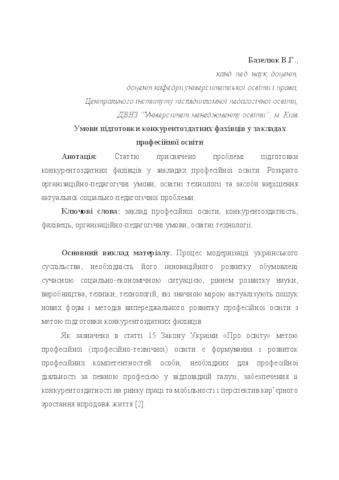 - Базелюк, В.Г. (2018) Conditions of preparation of competitive specialists in professional educational institutions Підготовка конкурентоздатних фахівців: виклики сучасності: зб. матеріалів Всеукр. наук.-практ. конф., 25-26 квітня 2018 р.. pp. 30-35.