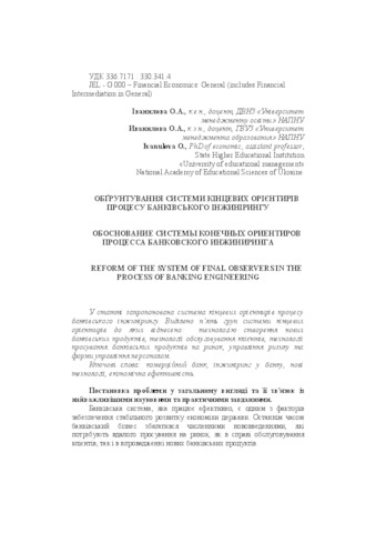- Іванилова, О. А. (2017) Reform of the system of final observers in the process of banking engineering Вісник Східноєвропейського університету економіки і менеджменту, 1 (22). pp. 118-122. ISSN 2078-1628