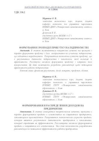 - Мурашко, О.В. and Думенков, В.В. (2016) Formation and distribution of company profits Науковий вісник УМО. Серія. Економіка та управління, 1. ISSN 2522-1280