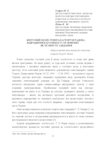 - Супрун, М.О. (orcid.org/0000-0002-4198-9527) and Пуйко, В.М. (2014) Life way of the General Georgiy Radov: revival of prisoners' spirituality as a personal task Науковий вісник Інституту кримінально-виконавчої служби. - Спец. номер. pp. 32-38.