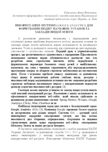 With the development of market mechanisms and increasing the role of public opinion, the problem of forming the image of scientific institutions and institutions of higher education is becoming increasingly relevant and more important. The success of their activities depends on the attitude of partners, consumers and society as a whole. The first step in the management process that begins with the diagnosis is the start-up. The effectiveness of planning is largely conditioned by the ability of those who develop the plan to think strategically, that is, to predict and formulate the parameters of the desired state of things in the future, to determine which forces and factors will facilitate or hinder progress and choose a strategy for approaching the goal. Today, each academic institution and institution of higher education have their own electronic resource. It is important to analyze the relevance and effectiveness of using a website that can be implemented through a variety of analytical systems: Spring Metrics, Woopra, Google Analytics, Clicky, Mint, Chartbeat, etc. The most popular of these systems is the free Google Analytics service.