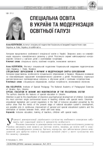 - Колупаєва, А.А. (orcid.org/0000-0002-4610-5081) (2014) The special education in Ukraine and modernization of the educational sector Особлива дитина: навчання і виховання, 3 (71). pp. 7-12. ISSN 2312-2781