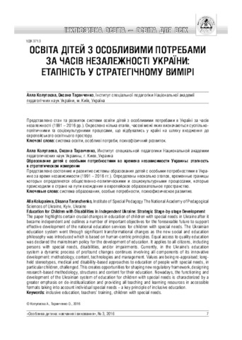 - Колупаєва, А.А. (orcid.org/0000-0002-4610-5081) and Таранченко, О.М. (2016) Education for children with disabilities in independent Ukraine: strategic stage-by-stage development Особлива дитина: навчання і виховання, 3 (79). pp. 7-18. ISSN 2312-2781
