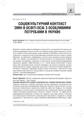 - Таранченко, О.М. (2016) The sociocultural context changes in education of people with disabilities in Ukraine Особлива дитина: навчання і виховання, 4 (80). pp. 87-96. ISSN 2312-2781