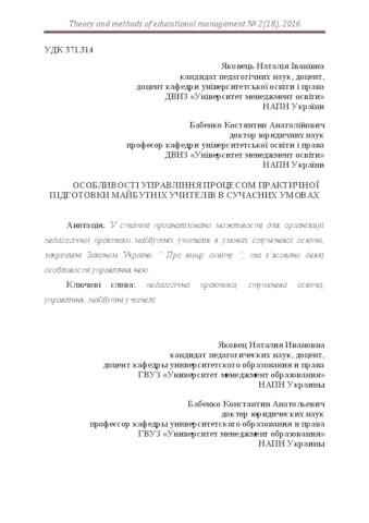 - Яковець, Н.І. and Бабенко, Костянтин Анатолійович (2016) Features of management process of practical training of future teachers in modern conditions Теорія та методика управління освітою, 2 (18). ISSN 2310-2411