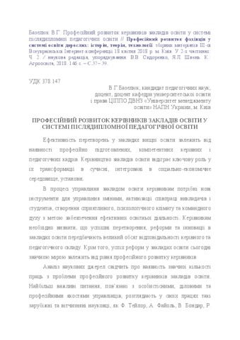 - Базелюк, В.Г. (2018) Professional development of education institute managers in the pedagogical pedagogical education system In: Професійний розвиток фахівців у системі освіти дорослих: історія, теорія, технології: збірник матеріалів ІІІ-ої Всеукраїнської Інтернет-конференції 18 квітня 2018 р. м. Київ , 2 . Агроосвіта, м. Київ, Україна, pp. 37-39.