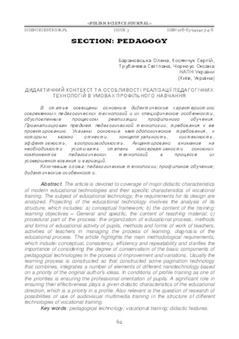 - Барановська, Олена Володимирівна, Косянчук, Сергій Володимирович, Трубачева, Світлана Едуардівна and Чорноус, О.В. (2018) Didactic context and peculiarities of pedagogical technologies in the profile education Polish Science Journal, 3. pp. 62-72. ISSN ISBN 978-83-949403-4-8
