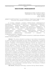 The article is devoted to coverage of major didactic characteristics of modern educational technologies and their specific characteristics of vocational training. The subject of educational technology, the requirements for its design are analyzed. Projecting of the educational technology involves the analysis of its structure, which includes: a) conceptual framework; b) the content of the training: learning objectives – General and specific, the content of teaching material; c) procedural part of the process: the organization of educational process, methods and forms of educational activity of pupils, methods and forms of work of teachers, activities of teachers in managing the process of learning, diagnosis of the educational process. The article highlights the main methodological requirements, which include: conceptual, consistency, efficiency and repeatability and clarifies the importance of considering the degree of conservatism of the basic components of pedagogical technologies in the process of improvement and variations. Usually the learning process is constructed so that constructed some pagination technology that combines, integrates a number of elements of different nanotechnology based on a priority of the original author's ideas. In conditions of profile training as one of the priorities is ensuring the professional orientation of pupils. A significant role in ensuring their effectiveness plays a given didactic characteristics of the educational direction, which is a priority in a profile. Also relevant is the question of research of possibilities of use of audiovisual multimedia training in the structure of different technologies of vocational training.
