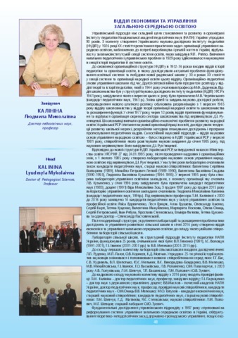 - Калініна, Л.М. (2016) Department of economics and management of secondary education Літопис сучасної освіти і науки України: «Інститут педагогіки НАПН України: 90 років історії і звершень». pp. 48-50. ISSN 978-617-7430-01-7