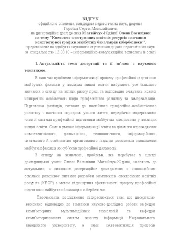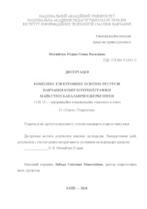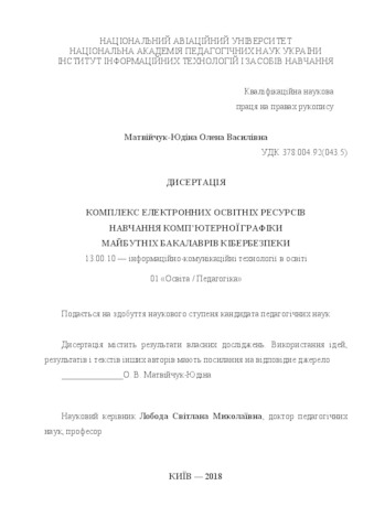 - Матвійчук-Юдіна, О.В. (orcid.org/0000-0002-5906-5023) (2018) Complex of electronic educational resources of computer graphics training for future bachelors of cybersecurity Dissertation candidate thesis, Національний авіаційний університет.