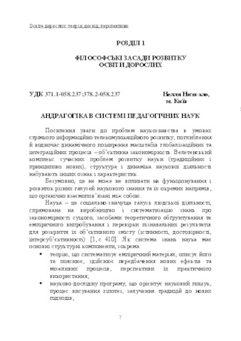 - Ничкало, Нелля Григорівна (orcid.org/0000-0002-5989-5684) (2009) Andragogy in the system of pedagogical sciences Освіта дорослих: теорія, досвід, перспективи, 1. pp. 7-20. ISSN 2308-6386