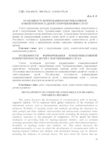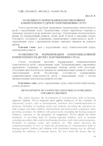- Жук, В.В. (orcid.org/0000-0001-8183-5250) (2017) Development of communication skills in hearing-impaired children Освіта осіб з особливими потребами: шляхи розбудови (12). pp. 40-48. ISSN 2313-4011