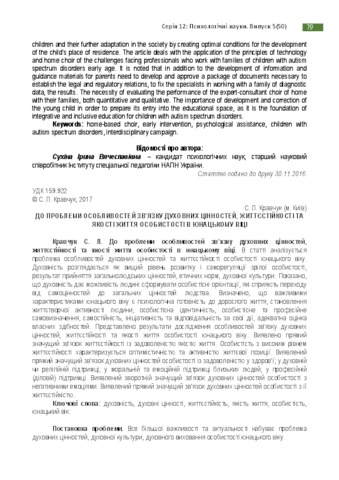 - Кравчук, С.Л. (orcid.org/0000-0002-6951-1912) (2017) To the problem of the peculiarities of the relationship of spiritual values, hardiness and quality of life of the personality in adolescence Науковий часопис Національного педагогічного університету імені М.П. Драгоманова. Серія Психологічні науки, 5 (50) (12). pp. 79-87. ISSN 2412-9968