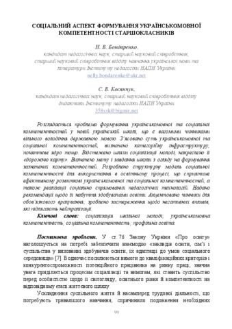 - Бондаренко, Неллі Володимирівна (orcid.org/0000-0002-4033-7287) and Косянчук, Сергій Володимирович (orcid.org/0000-0003-1334-6011) (2018) The social aspect of forming of the Ukrainian-language competence in the upper secondary school pupils Гуманітарний вісник Полтавського національного технічного університету імені Юрія Кондратюка (3). pp. 99-113. ISSN 2521-1579