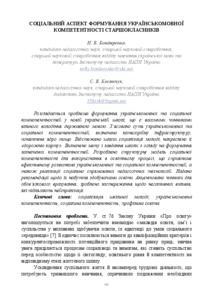 The general and linguistic culture guarantees successful professional activity, the prospect of career growth of the individual, its high social status and belonging to the Ukrainian elite. The Ukrainian language plays an important role in the process realization of life's plans for graduates of institutions of general secondary education. At the present stage of development of the new Ukrainian school, the issue of socialization of the younger generation must be resolved. The article defines the goals and objectives of the school, takes into account the need to developing core competencies in the upper secondary school pupils. The authors present social competence model in order to be able to use it in the educational process. The core of social competence is the notions among which the authors singled out the following: «a person as a biopsychosociocultural phenomenon»; «socialization»; «social adaptation»; «social interaction»; «social differentiation of society»; «social organization of society»; «social health»; «social origin»; «social environment»; «social development»; «social status»; «social groups»; «social institutions»; «social processes»; «social roles»; «important social system problems»; «socion»; «socionom». In the process of socialization of the individual, the school must take into account the following important factors: the dependence of the person’s life experience from the immediate environment and the microenvironment; individual-typological qualities of personality; historical situation; national peculiarities; the social origin of a person and the socio-economic position of the family; socio-cultural differences; sexual differences; the uniqueness of Ukrainian culture and Ukrainian society. An important role in the processes of socialization of the person plays reflection as a phenomenon of social conscience. Conclusions: socialization of upper secondary school pupils is an important task of the new Ukrainian school; the process of socialization of the pupils should be organized purposefully in the lessons of all subjects; the state Ukrainian language is one of the important factors of socialization and social adaptation of school youth; the development of competence-oriented pedagogical technology for teaching the Ukrainian language and the appropriate methodology for measuring its results is a time requirement; creating and implementing the technology of competence training of the Ukrainian language, it is necessary to take into account the main components of the structure of social competence.