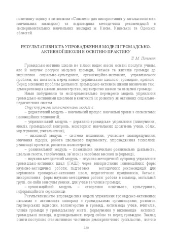 Implementation by the experimental educational institutions of the Kyiv and Zhytomyr regions of the model of management of public-active schools in the context of their development as active social and pedagogical systems contributes to the development of managerial competence of the head of the educational institution, the civic activism of teachers, students, parents, community members, strengthening partnerships, development of volunteering.