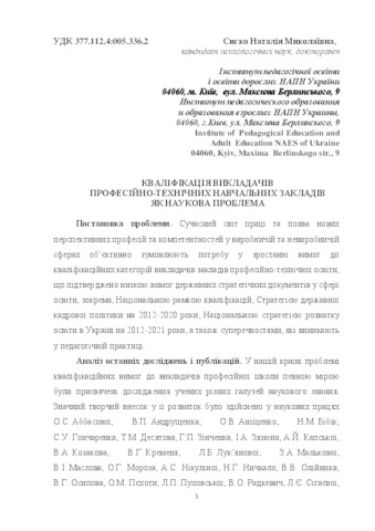 - Сиско, Наталія Миколаївна (2017) The qualifications of teachers of vocational education institutions as a scientific problem Професійна освіта: проблеми і перспективи (13). pp. 65-69. ISSN 2411-6238