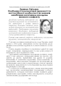 - Кравчук, С.Л. (orcid.org/0000-0002-6951-1912) (2018) The peculiarities psychological resilience and hardiness of personality as factors of prevention of negative consequences of military conflict Психологічні виміри культури, економіки, управління (11). pp. 156-164. ISSN 2409-1375