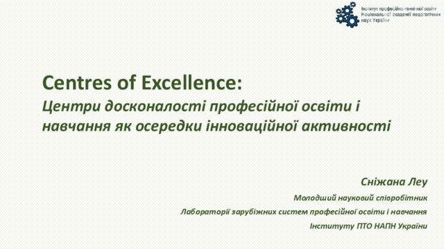 - Леу, Сніжана Олексіївна (orcid.org/0000-0001-8616-1005) (2018) Centres of Excellence for VET In: Innovations for VET development: foreign and local experience, 21 червня 2018, м. Київ, Україна. (Unpublished)