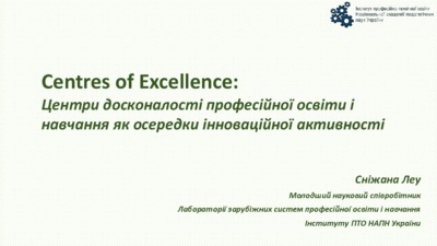 In modern sector of education the Centres of Excellence (CoE) are being widely spread. In many countries CoEs are already in place and work successfully in VET field as a result of Goverment's initiatives and/or in framework of international projects.