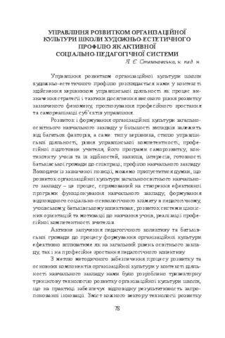 - Стемковська, Ярослава Євгенівна (2015) Management of the development of organizational culture of the school of artistic and aesthetic profile as an active social-pedagogical system In: Анотовані результати науково-дослідної роботи Інституту педагогіки НАПН України за 2015 рік . Педагогічна думка, м. Київ, Україна, pp. 78-79. ISBN 978-966-644-398-5