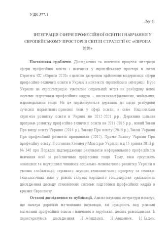 - Леу, Сніжана Олексіївна (orcid.org/0000-0001-8616-1005) (2015) Integration of vocational education and training in the European context within the meaning of the EU Strategy “Europe 2020” Професійна освіта: проблеми і перспективи (9). pp. 109-116. ISSN 2411-3425