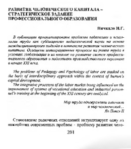 - Ничкало, Нелля Григорівна (orcid.org/0000-0002-5989-5684) (2012) The development of human capital is the strategic task of professional education Модернізація професійної освіти: теорія, досвід, проблеми (VI Міжнародні наукові читання присвячені пам'яті С. Батишева). pp. 201-220.