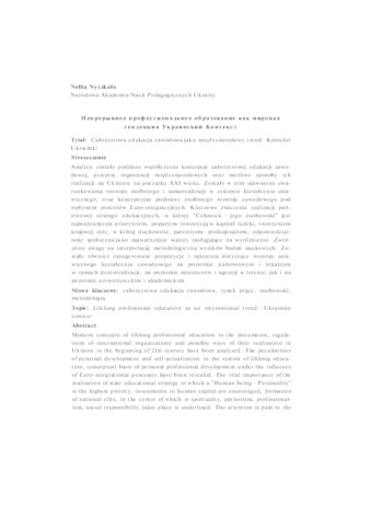 Nychkalo, Nellia (orcid.org/0000-0002-5989-5684) (2017) Lifelong professional education as a world trend. Ukrainian Context (323). Wydawnictwo Uczelniane Politechniki Koszalinskiej, c. Koszalin, Poland, pp. 261-283. ISBN 978-83-7365-451-8